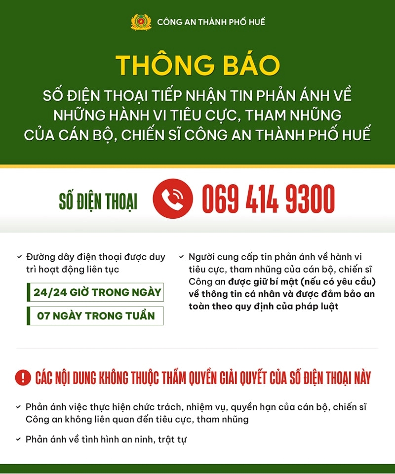 Bên cạnh đó, Công an TP. Huế cũng lưu ý số điện thoại trên sẽ không tiếp nhận phản ánh về tình hình an ninh, trật tự cũng như việc thực hiện chức trách, nhiệm vụ, quyền hạn của cán bộ, chiến sĩ Công an không liên quan đến tiêu cực, tham nhũng.