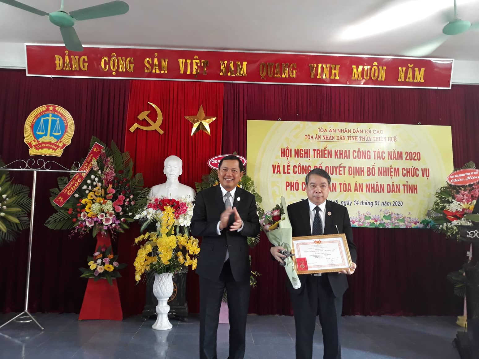 Ông Vũ Văn Minh, Chánh án TAND thị xã Hương Trà (phải) vinh dự nhận Quyết định bổ nhiệm chức vụ Phó Chánh án TAND tỉnh