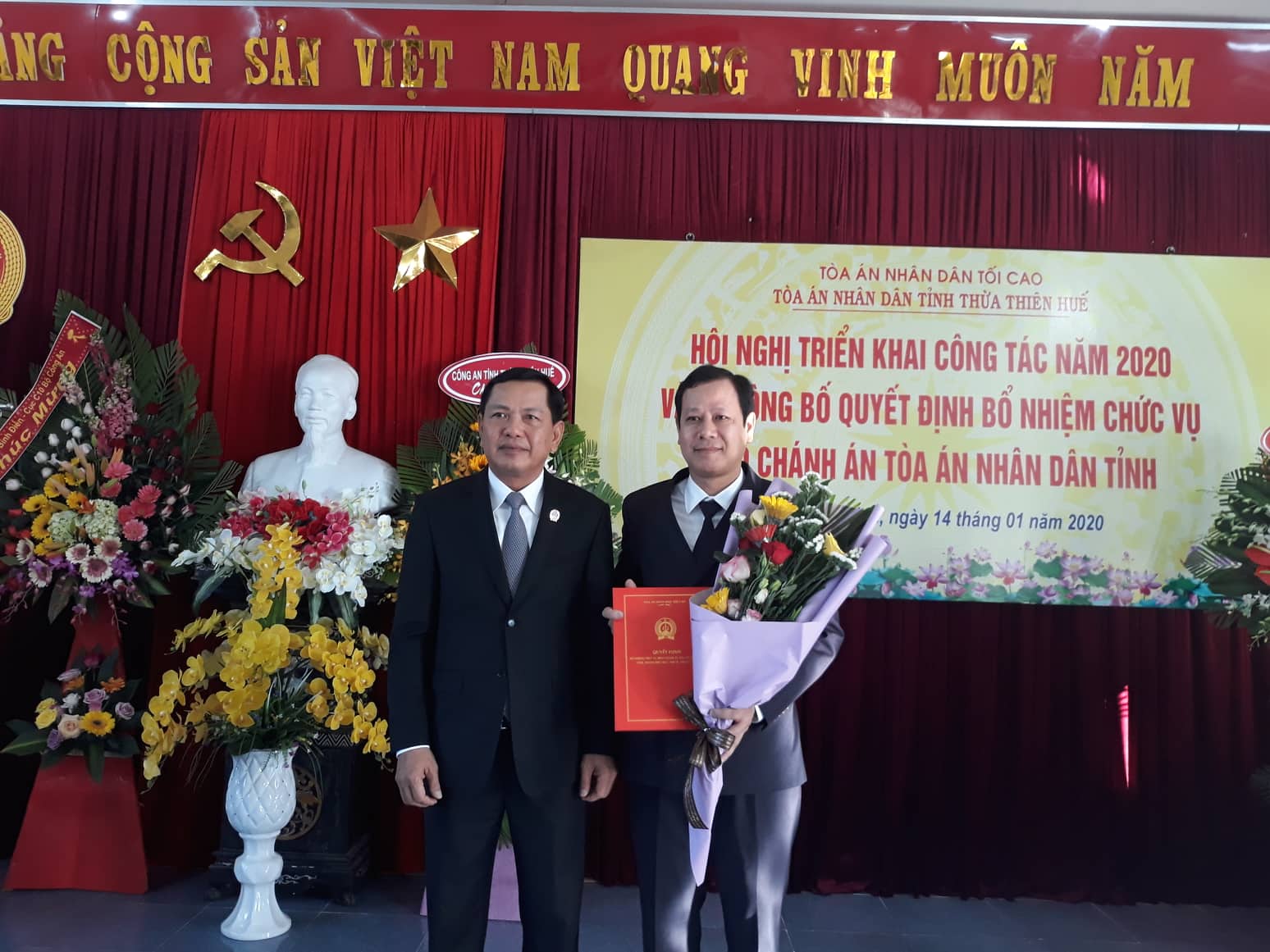 Dịp này, thừa ủy quyền của Chánh án TAND tối cao, bà Đào Thị Tú Hoa, Phó vụ trưởng Vụ TCCB công bố Quyết định của Chánh án TAND tối cao bổ nhiệm ông Vũ Văn Minh sinh năm 1974, Thẩm phán Trung cấp, Chánh án TAND thị xã Hương Trà, tỉnh Thừa Thiên Huế, giữ chức vụ Phó Chánh án TAND tỉnh Thừa Thiên Huế, nhiệm kỳ 5 năm, kể từ ngày 15/12/2019.