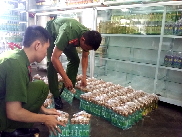 Tiến hành kiểm tra, Đội Cảnh sát phòng chống tội phạm về Môi trường phát hiện 1087 chai dầu được dán nhãn mác Phước Quy và Thiên An không đảm bảo tiêu chuẩn chất lượng như đã công bố.