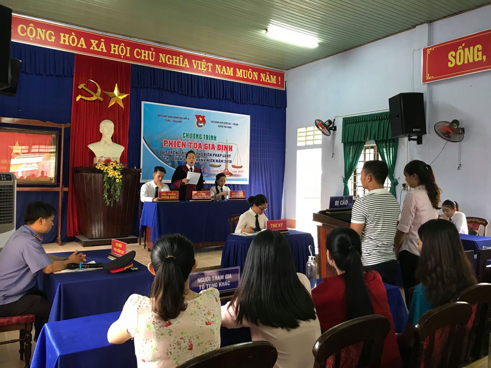 Tại phiên tòa giả định, ĐVTN Chi đoàn VKSND-TAND huyện Phú Vang, các kiểm sát viên VKSND, thư ký TAND huyện Phú Vang và sinh viên Trường đại học Luật - Đại học Huế “đóng vai” hội đồng xét xử (gồm thẩm phán, hội thẩm Nhân dân), kiểm sát viên, luật sư, các bị cáo, nhân chứng để tiến hành tố tụng và tham gia tố tụng tại phiên tòa. Hơn 300 ĐVTN, học sinh các xã Vinh Hà, Vinh Phú, Phú Xuân, Phú Lương, Phú Hồ, thị trấn Phú Đa dự khán.
