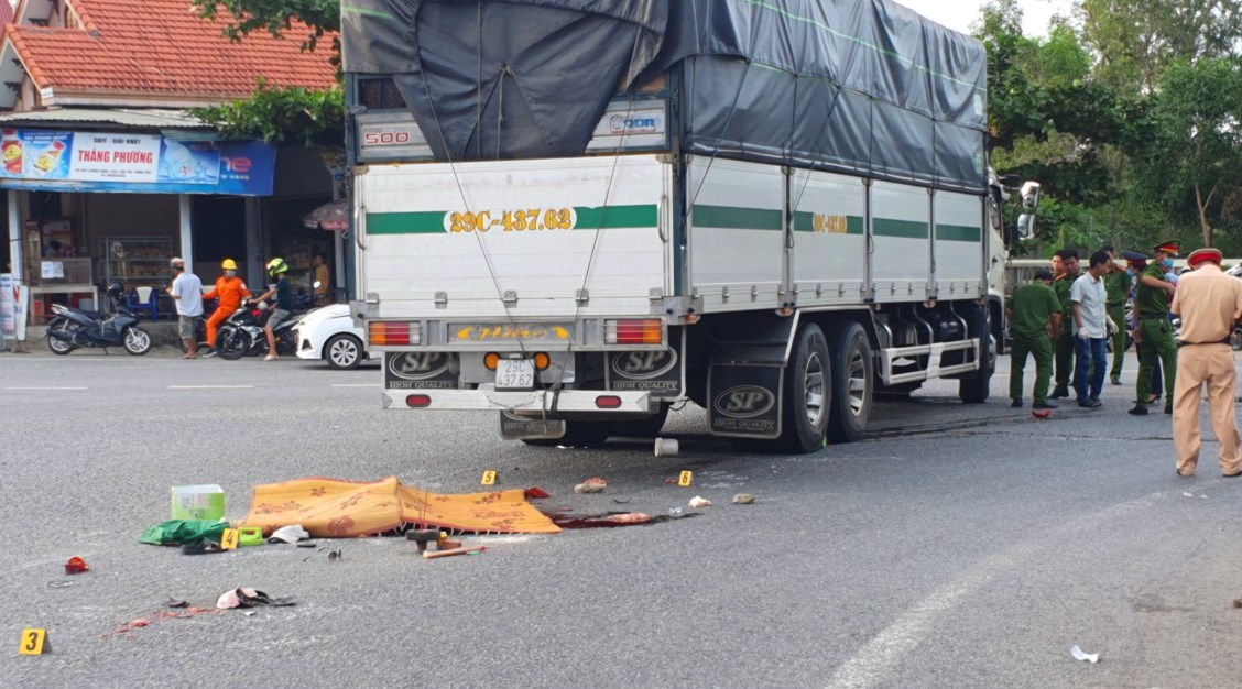 Sau vụ va chạm, xe máy bị cuốn vào gầm xe tải khiến bà Nguyễn Thị Loan chết tại chỗ, ông Võ Văn Quốc bị thương nặng, hiện đang cấp cứu tại Bệnh viện Trung ương Huế.