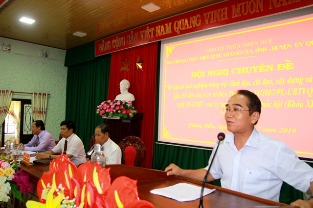 HNN.VN - Phó Bí thư Thường trực Tỉnh ủy Bùi Thanh Hà đã chỉ đạo như vậy tại hội nghị chuyên đề “Kết quả và kinh nghiệm trong việc lãnh đạo, chỉ đạo, xây dựng và thực hiện quy chế dân chủ ở cơ sở theo Pháp lệnh 34/2007/PL - UBTVQH11, ngày 20/4/2007 của Ủy ban Thường vụ Quốc hội (khóa XI)” do Ban Chỉ đạo thực hiện Quy chế dân chủ ở cơ sở của tỉnh và Huyện ủy Quảng Điền tổ chức chiều 3/7.