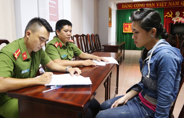 | Huỳnh Thanh Tâm- đối tượng giả gái đang được công an thẩm vấn |