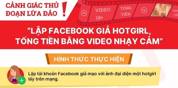 Hình thức thực hiện của các đối tượng là, lập tài khoản facebook giả mạo, sử dụng ảnh đại diện là một hotgirl được lấy từ trên mạng. Sau đó, chủ động nhắn tin dụ dỗ nạn nhân tự quay video “nhạy cảm” của chính họ gửi cho đối tượng.