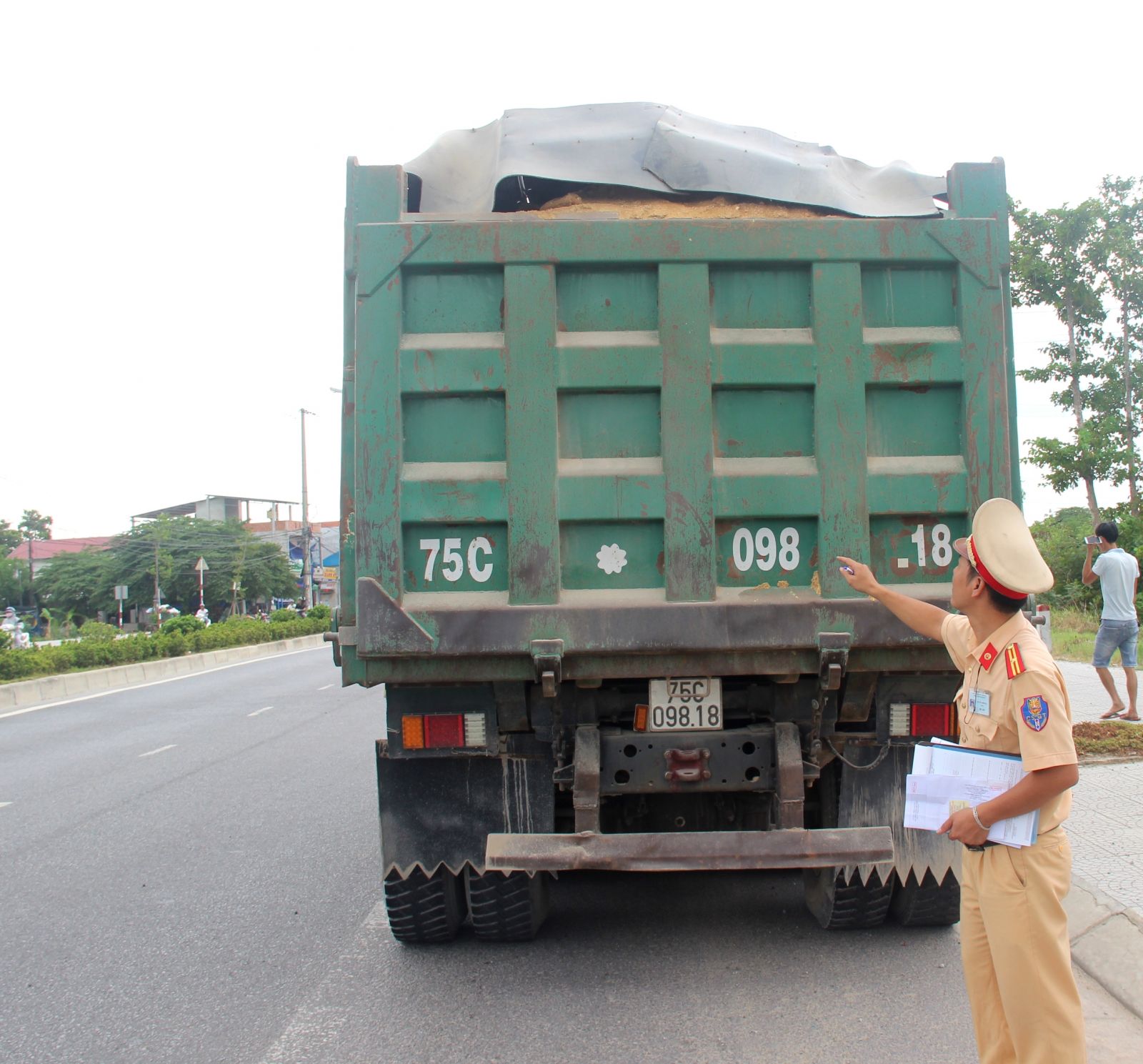 Không lâu sau đó, một xe ô tô tải khác chở đầy đất từ hướng Phong Điền vào TP. Huế trờ tới cũng đã bị lực lượng CSGT – Trật tự Công an TP. Huế ra tín hiệu dừng xe để kiểm tra. Tài xế ô tô tải BKS 75C – 00865 Châu Quang (SN 1969) trú tại phường Hương An (TX. Hương Trà) cho biết: “Xe tôi cũng chở đất vào TL 10 huyện Phú Vang để san lấp mặt bằng. Do che chắn cẩn thận, nên tôi chỉ bị lực lượng CSGT tuyên truyền, nhắc nhở lái xe an toàn và tuân thủ nghiêm Luật Giao thông đường bộ”.