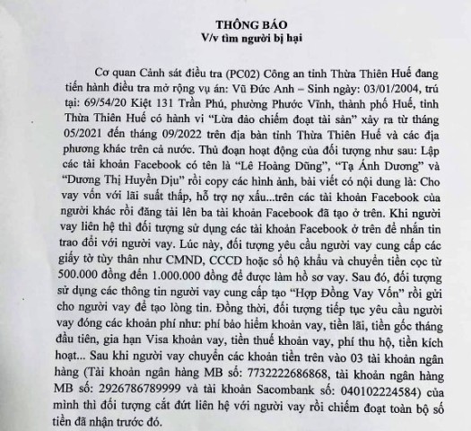 Cơ quan Cảnh sát điều tra Công an tỉnh thông tin, nếu tổ chức và cá nhân nào là bị hại của vụ án có phương thức, thủ đoạn nêu trên, liên hệ với Phòng Cảnh sát hình sự Công an tỉnh (số 02 Nguyễn Thái Học, phường Phú Hội, TP. Huế, tỉnh Thừa Thiên Huế hoặc liên hệ điều tra viên thụ lý vụ án Phan Nguyễn Nhân Hạnh, số điện thoại 0932.493.444) để được hướng dẫn, giải quyết.