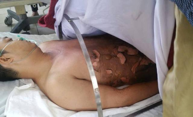 Anh Võ Trọng Nghĩa bị bỏng nặng đang được điều trị tại Bệnh viện Trung ương Huế