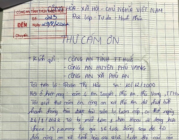 Đó là lá thư của chị Đoàn Thị Hải (SN 2000), trú tại huyện Phú Vang cám ơn Công an xã Phú An, Công an huyện Phú Vang đã kịp thời điều tra, làm rõ và trả lại tài sản bị mất cắp.