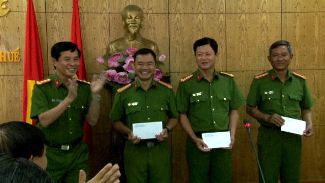 Sáng 14/9, Đại tá Hoàng Long, Trưởng Công an TP. Huế (ngoài cùng bên trái) trao thưởng cho các đơn vị