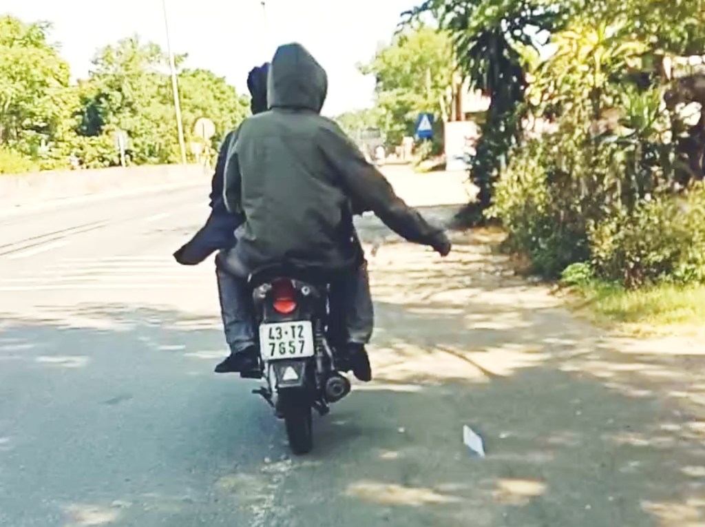 Hình ảnh các đối tượng vừa đi xe máy vừa rải tờ rơi quảng cáo. Ảnh trích từ clip