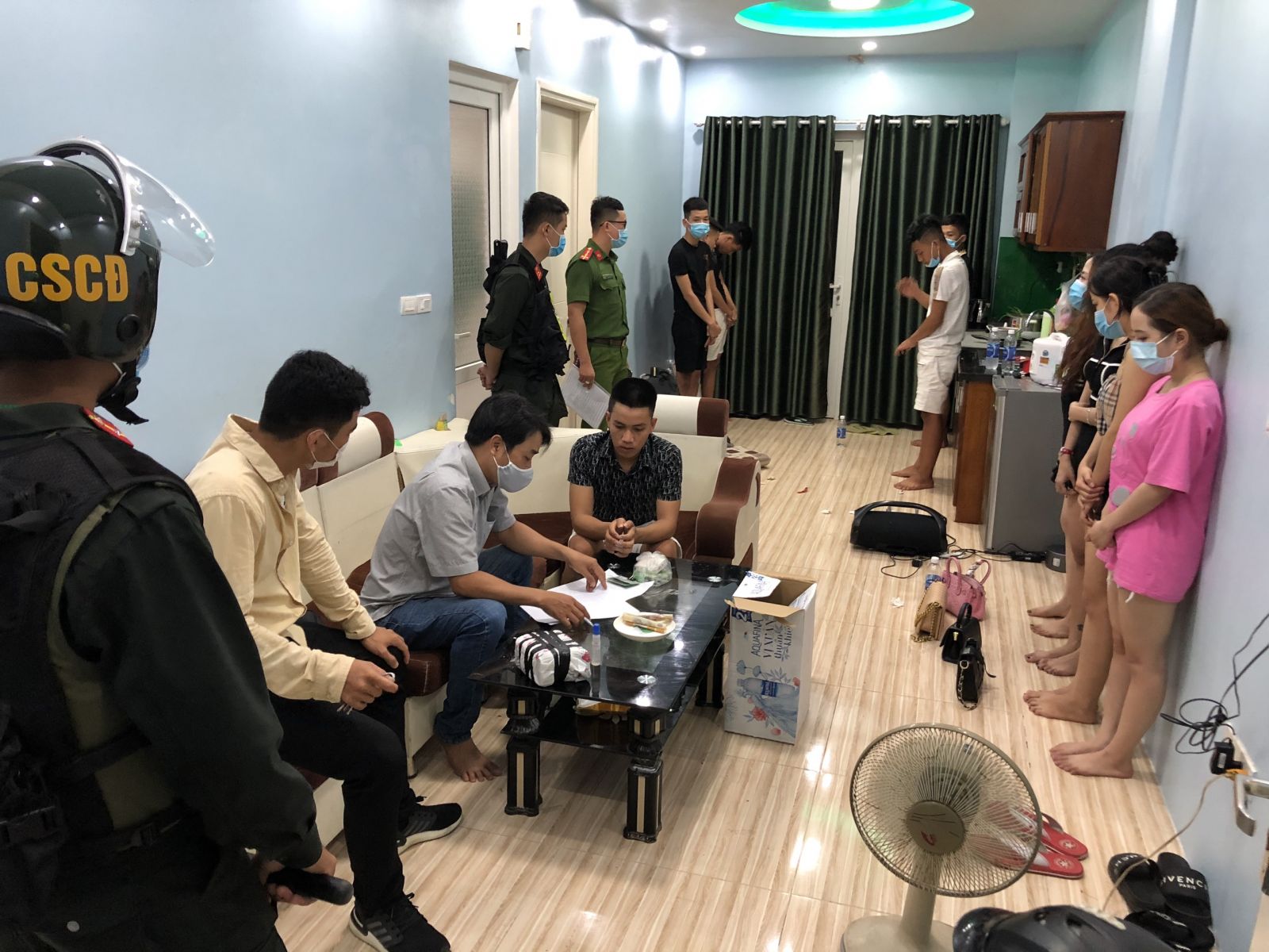 Trước đó, Công an phường Xuân Phú bất ngờ kiểm tra hành chính tại căn hộ số 812A chung cư Aranya và phát hiện 14 đối tượng (gồm 9 nam, 5 nữ) có biểu hiện “phê” ma túy.