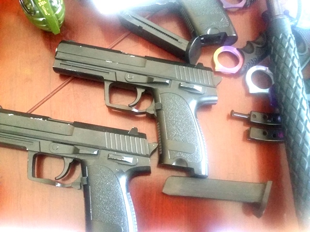 Tiếp tục kiểm tra tại nhà Nguyễn Thanh Thiện, lực lượng chức năng phát hiện, thu giữ 4 cây kiếm Nhật, 4 khẩu súng bắn bi nhựa, 5 cây dao găm và 15 bộ giá đỡ kiếm.