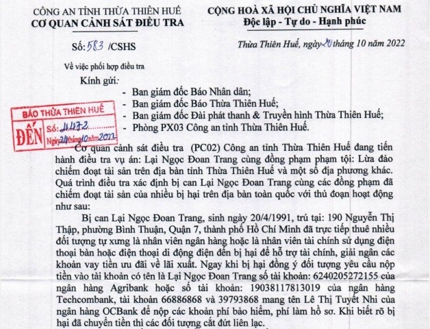 Thông báo văn bản tố tụng của Cơ quan Cảnh sát điều tra Công an tỉnh gửi đến Báo Thừa Thiên để phối hợp truyền thông, giúp người dân biết và cảnh giác