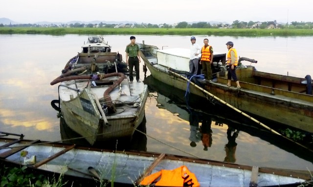HNN.VN - Từ 2 đến 4 giờ sáng 18/5, lực lượng chức năng xã Phú Mậu (Phú Vang) phối hợp đồng bộ các ban, ngành liên quan đã tiến hành tuần tra, phát hiện, bắt quả tang hai chủ thuyền khai thác cát trái phép ở khu vực hạ lưu sông Hương thuộc địa bàn xã quản lý.