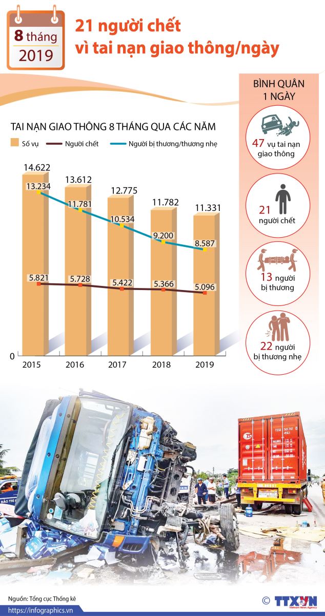 Bình quân một ngày trong 8 tháng năm 2019, cả nước xảy ra 47 vụ tai nạn giao thông, làm 21 người chết. So với cùng kỳ năm 2018, tai nạn giao thông giảm ở tất cả các tiêu chí.