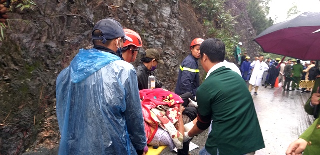 Lực lượng chức năng đưa người bị thương nặng nằm mắc kẹt trong xe ra ngoài để đưa đi cấp cứu cùng 4 người khác