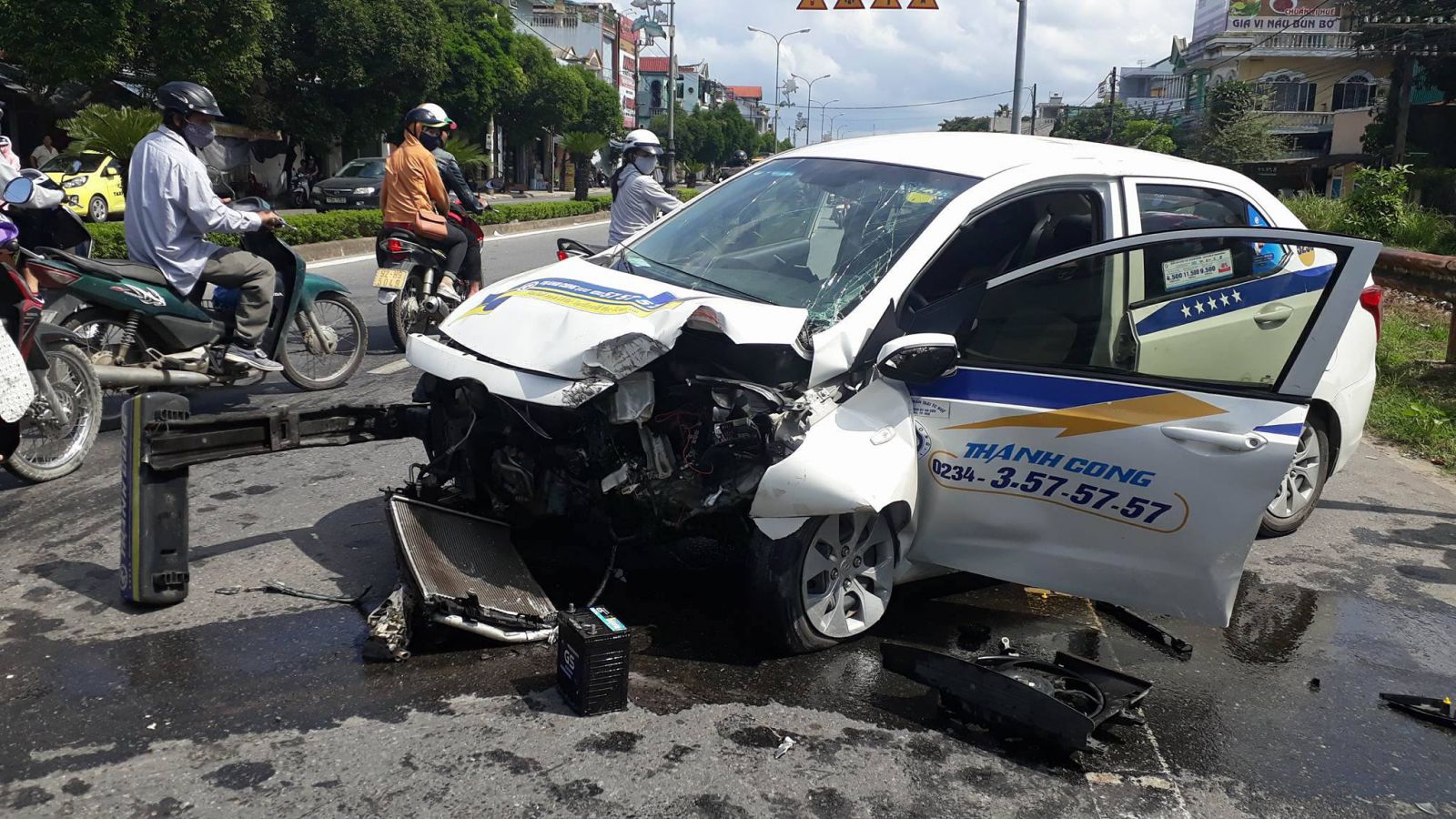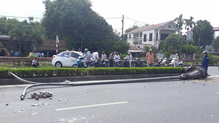 Khi đến đoạn đường trên thì bất ngờ tài xế mất lái, tông thẳng vào cột đèn cao áp cao hơn 5m đặt ở giữa đường khiến cột đèn gãy đổ xuống đường, phần đầu xe taxi hư hại hoàn toàn.