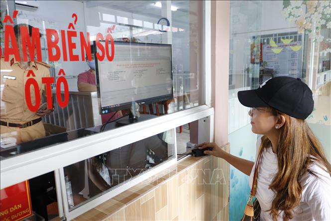 Người dân đến đăng ký và thực hiện bấm nút lấy biển số xe ô tô tại Công an huyện Phong Điền, thành phố Cần Thơ. Ảnh: TTXVN phát