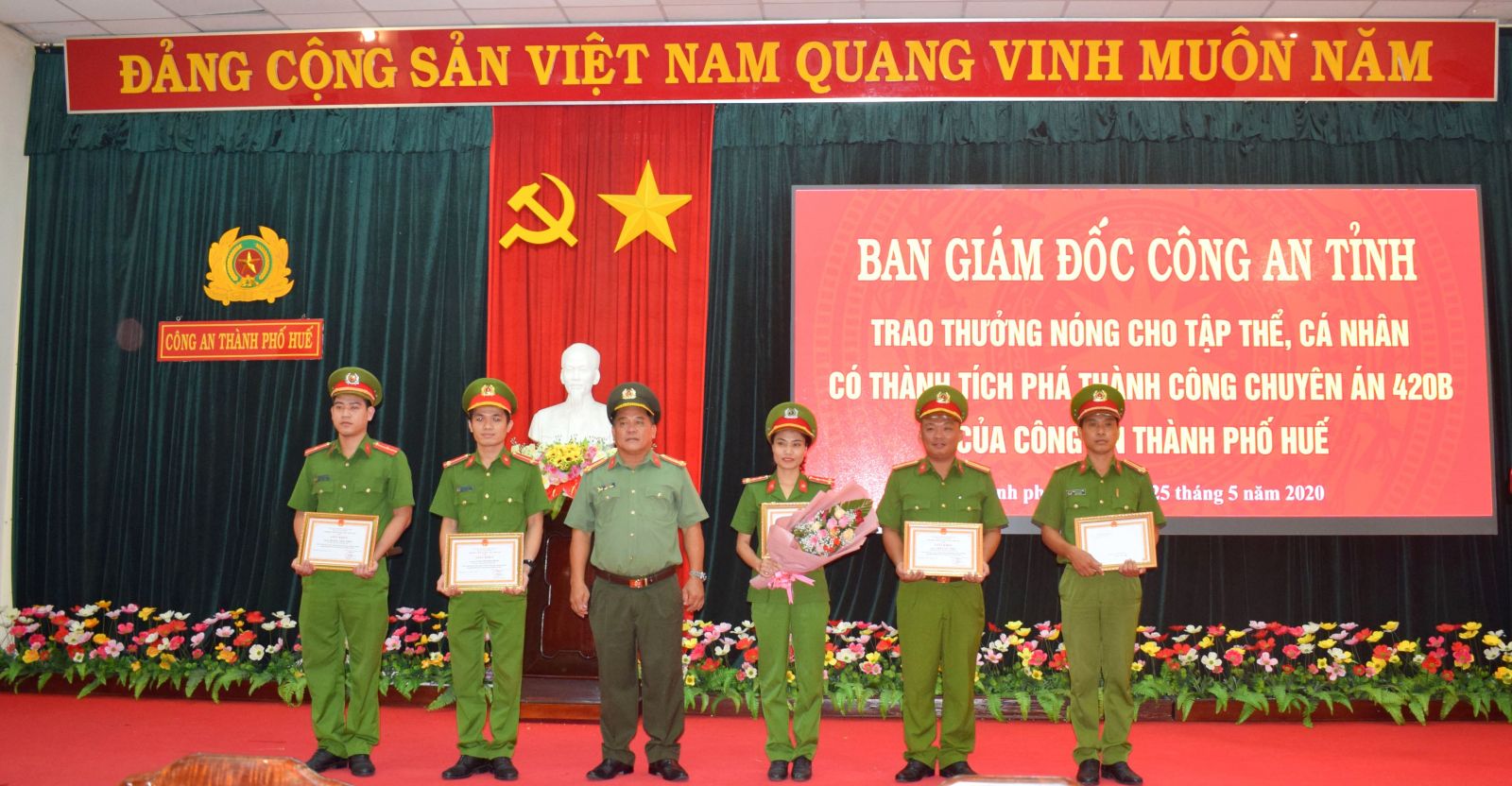 Thay mặt Đảng ủy, Ban Giám đốc Công an tỉnh, Đại tá Lê Văn Vũ, Phó Giám đốc Công an tỉnh đã trao thưởng cho Ban Chuyên án 420B, tập thể Đội Cảnh sát Điều tra tội phạm về ma túy Công an TP. Huế và 6 cá nhân đã có thành tích xuất sắc trong công tác đấu tranh, phá thành công chuyên án ma túy.