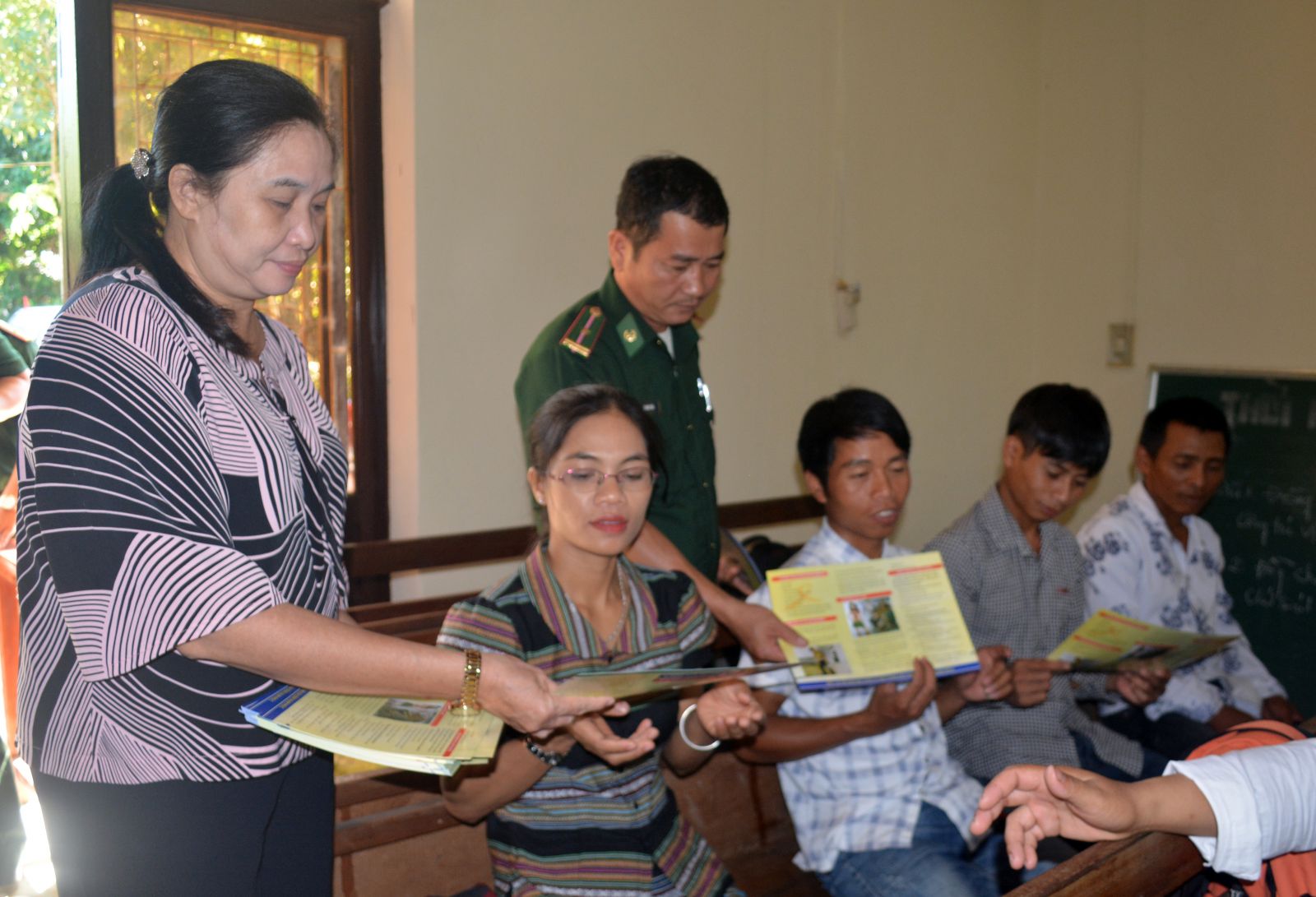 Các tuyên truyền viên phát tờ rơi tuyên truyền cho người dân