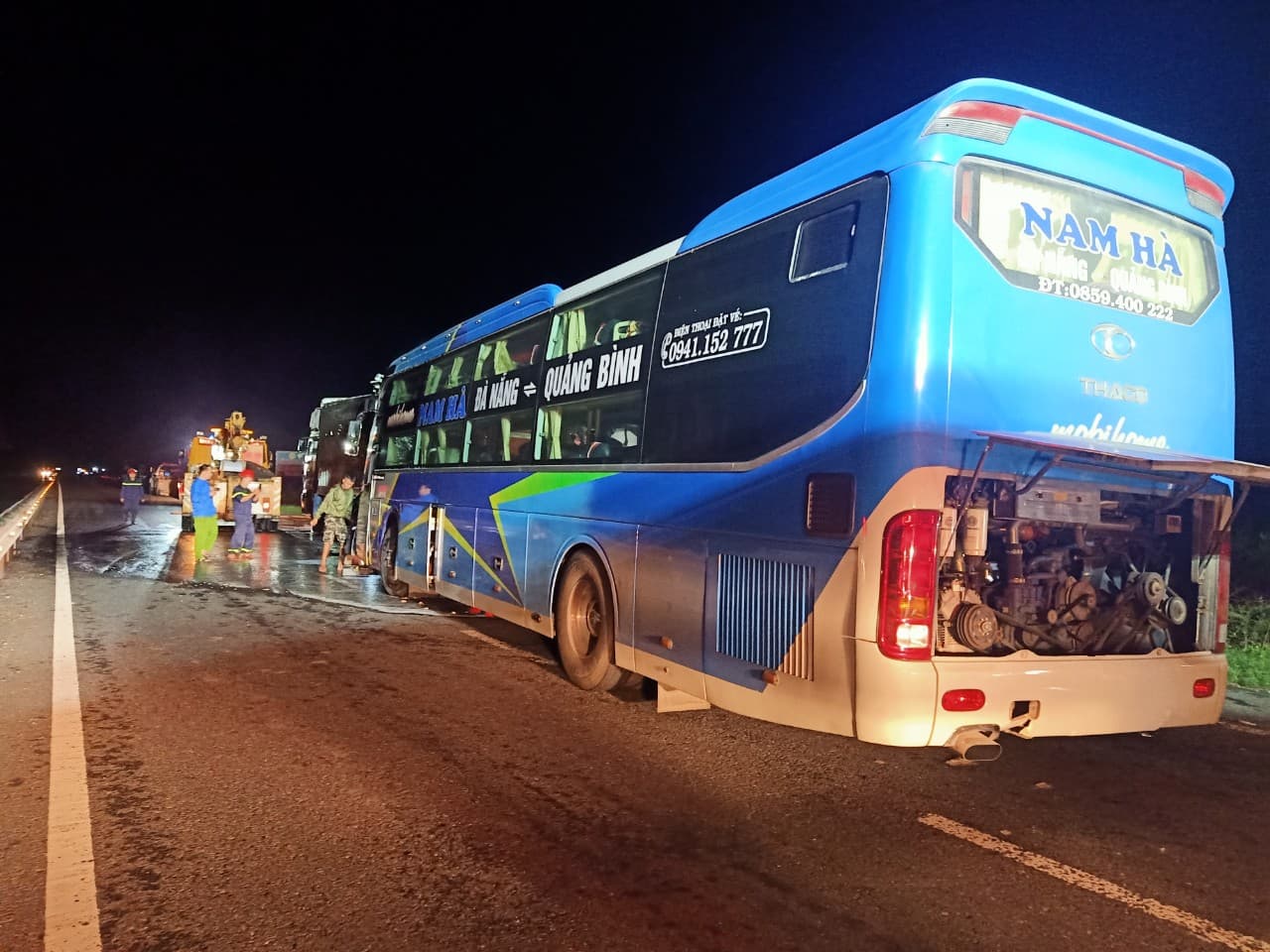 Trước đó, vào khoảng 1 giờ cùng ngày, xe khách mang BKS 43B-028.75 do Phạm Văn Công (SN 1984, ngụ huyện Lệ Thủy, tỉnh Quảng Bình) điều khiển theo hướng Bắc – Nam. Khi đến vị trí nói trên đã va chạm vào sau xe ô tô tải BKS 37C-166.65 do anh Trần Văn Quyền (SN 1982; ngụ TP. Vinh, tỉnh Nghệ An) điều khiển theo hướng lưu thông cùng chiều. Thời điểm này xe tải bị hỏng lốp đang sửa chữa trên đường thì bị xe khách tông vào.