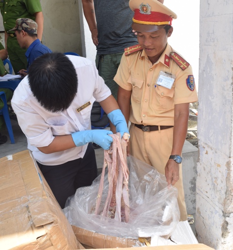 Qua kiểm tra, lực lượng CSGT phát hiện trên xe đang vận chuyển 26 thùng xốp chứa nội tạng động vật với tổng trọng lượng hơn 1.600kg. Tài xế Phạm Thanh Hoàng không xuất trình được các loại giấy tờ chứng minh nguồn gốc xuất xứ của số hàng nói trên.