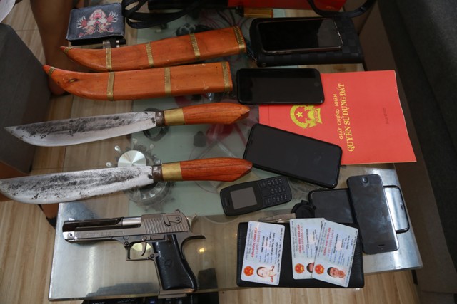 Tại đây, cơ quan Công an đã phát hiện và thu giữ số tiền hơn 100 triệu đồng; 4 thùng đựng sổ sách, tài liệu thể hiện việc cho vay tiền; 2 con dao kim loại dài khoảng 50cm; 2 đùi sắt; 1 khẩu súng nhựa được các đối tượng dùng để đe dọa đòi nợ và 1 xe máy trộm cắp.