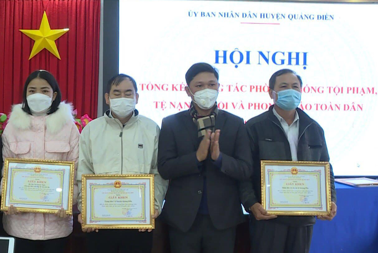 Dịp này, UBND huyện Quảng Điền tặng giấy khen cho 4 tập thể, 6 cá nhân có thành tích xuất sắc trong công tác phòng chống tội phạm, tệ nạn xã hội và xây dựng phong trào toàn dân bảo vệ an ninh tổ quốc năm 2021.