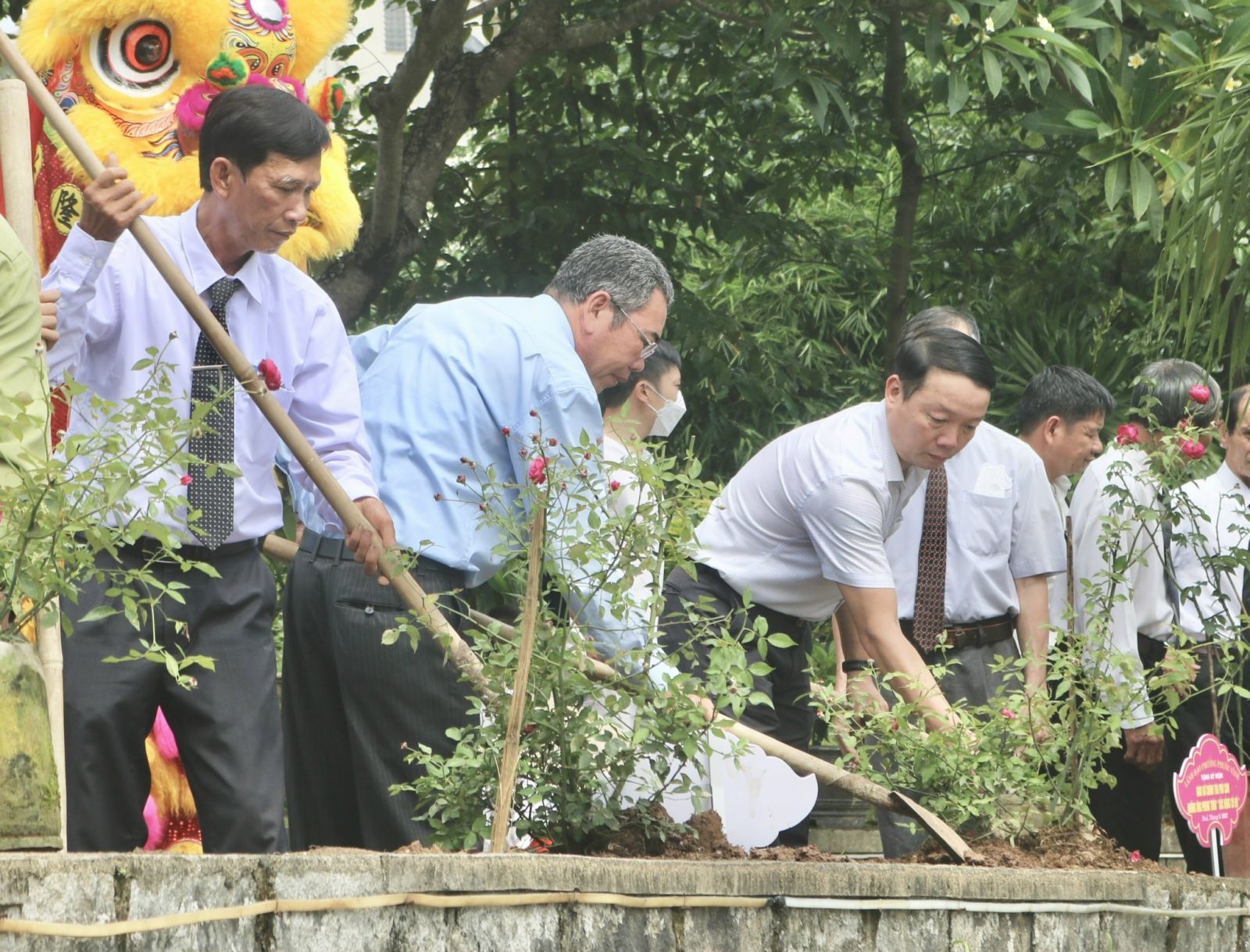 Lãnh đạo thành phố cùng đại diện Hội đồng giáo xứ trồng hồng cổ Huế tại Nhà thờ Phủ Cam