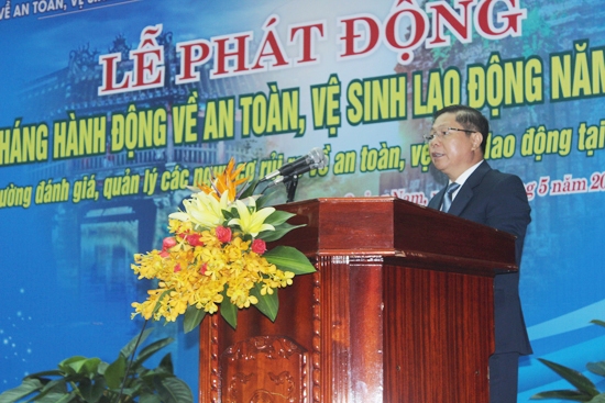 Thứ trưởng Bộ LĐ-TB&XH Lê Tấn Dũng phát biểu phát động Tháng hành động về ATVSLĐ. Ảnh: D.L