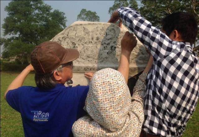 Giảng viên hướng dẫn phương pháp lấy bản rập chi tiết các hoa văn trên bia đá tại Võ thánh - Huế. Ảnh Phan Lê Chung