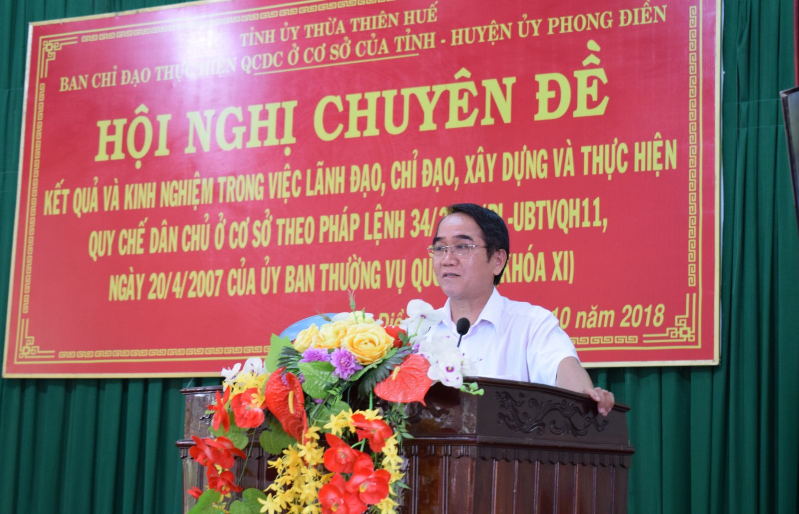HNN.VN - Sáng 31/10, Ban Chỉ đạo thực hiện quy chế dân chủ (QCDC) ở cơ sở tỉnh phối hợp với Huyện ủy Phong Điền tổ chức Hội nghị chuyên đề về kết quả và kinh nghiệm trong việc lãnh đạo, chỉ đạo xây dựng, thực hiện quy chế dân chủ ở cơ sở theo Pháp lệnh 34 của Ủy ban Thường vụ Quốc hội khóa XI về “Thực hiện dân chủ ở xã, phường, thị trấn”.