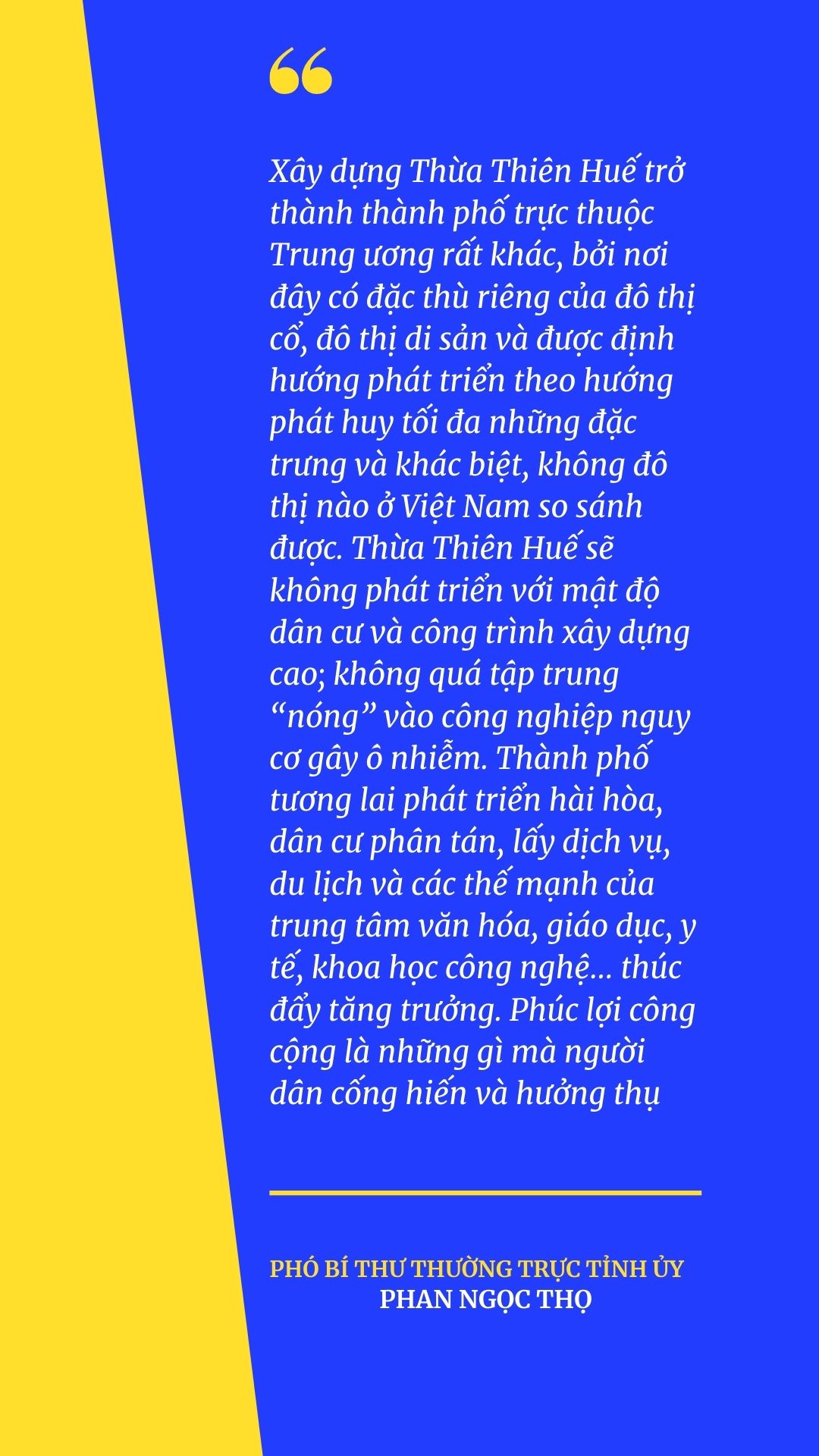 Xây dựng Thừa Thiên Huế thành thành phố trực thuộc Trung ương mở đường thu hút nguồn lực cho bảo tồn và phát huy những giá trị vô giá của di sản Cố đô Huế và tạo sức mạnh động viên to lớn cho toàn Đảng bộ, Nhân dân Thừa Thiên Huế trong chặng đường phát triển tiếp theo.