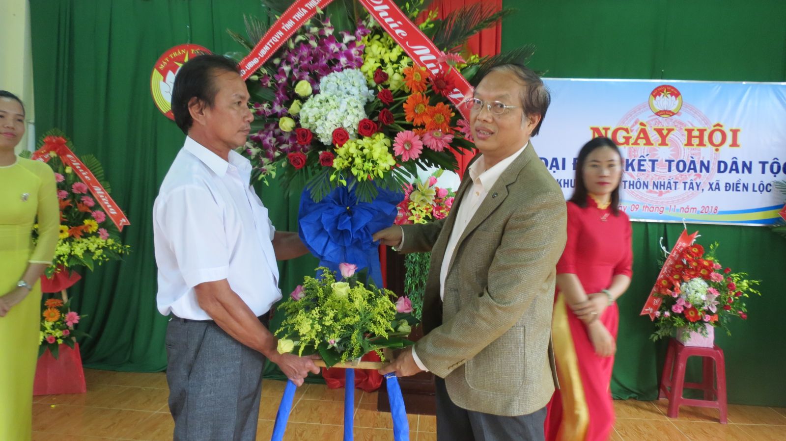 Ông Lê Đình Khánh - Phó giám đốc Sở kế hoạch và đầu tư thay mặt lãnh đạo tỉnh tặng hoa chúc mừng của Tỉnh ủy- HĐND- BND-UBMTTQVN tỉnh tại thôn Nhất Tây