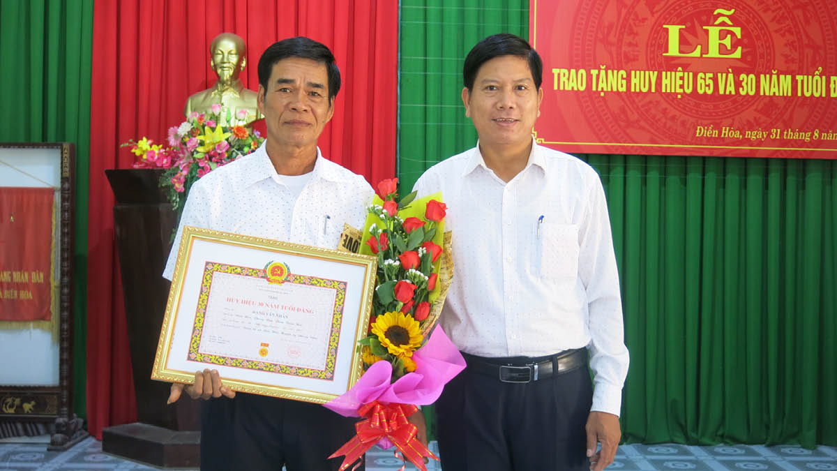 Ông Hồ Tá Thạnh, Trưởng ban Tổ chức Huyện ủy Phong Điền trao Huy hiệu 30 năm tuổi Đảng cho đảng viên Đặng Văn Nhân