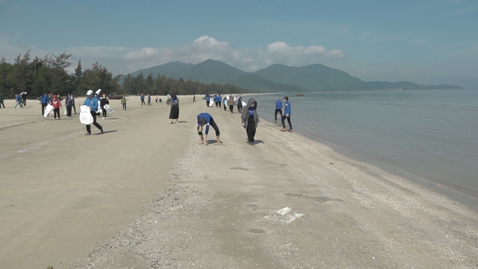 Tại bãi biển Bình An, xã Lộc Vĩnh, hơn 100 đoàn viên thanh niên tình nguyện của 35 tổ chức cơ sở đoàn, chiến sĩ Đồn Biên phòng cửa khẩu cảng Chân Mây ra quân vệ sinh môi trường biển.