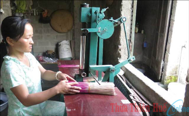 Trời nhá nhem tối, trong căn nhà nhỏ chật hẹp trên đường Lê Duẩn, chị Lê Thị Thúy Hạnh ở tổ 5, phường Phú Thuận, TP. Huế vẫn cần mẫn bên chiếc máy làm hương. Trong gian bếp nhỏ, cậu con trai đang thay mẹ chuẩn bị bữa cơm tối. Thấy khách, chị Hạnh vơ vội mấy bó hương trên sàn nhà lấy chỗ tiếp khách. Đôi bàn tay chai sần của chị đã nói hộ nỗi vất vả của người phụ nữ vừa làm “cha” vừa làm mẹ này. Ký ức tràn về làm hai hàng nước mắt chị lăn dài trên gương mặt. Những năm tháng khốn khó nhất bắt đầu với chị khi người chồng không may mắc bạo bệnh, mất năm 1994, để lại cho chị hai đứa con dại cùng đống nợ tiền thuốc men lo cho chồng trước đó. Không nghề nghiệp, chị làm đủ việc để nuôi con. Khi phong trào “Tiết kiệm nuôi heo đất vì phụ nữ nghèo” của phường ra đời, chị Hạnh được Hội LHPN phường hỗ trợ mua một máy làm hương. Có được “cần câu cơm”, chị không quản mệt nhọc “không kể ngày đêm, lúc nào rảnh tui lại ngồi vào máy làm hương” người phụ nữ tần tảo tâm sự. Năm 2012, được Hội LHPN tạo điều kiện, chị vay vốn ưu đãi mua thêm được chiếc xe máy. Có phương tiện đi lại, chị vừa làm hương vừa chạy đi bỏ hàng, cuộc sống của mẹ con chị đã “dễ thở” hơn. Từ hộ nghèo, năm 2015 chị Hạnh vươn lên thành hộ cận nghèo và đang phấn đấu thoát nghèo trong năm nay.