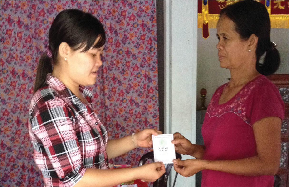 Cán bộ Hội LHPN xã Điền Hòa (bên trái) tặng sổ tiết kiệm cho gia đình chính sách