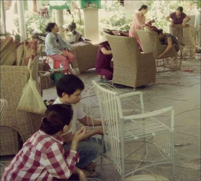 Xưởng đan bàn ghế bằng dây nhựa tại nhà riêng của chị Phượng