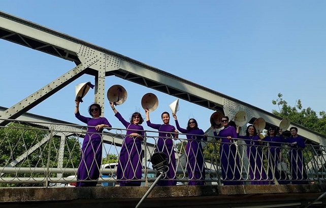 Tạo dáng tuyên truyền áo dài tím trên cầu Tràng Tiền