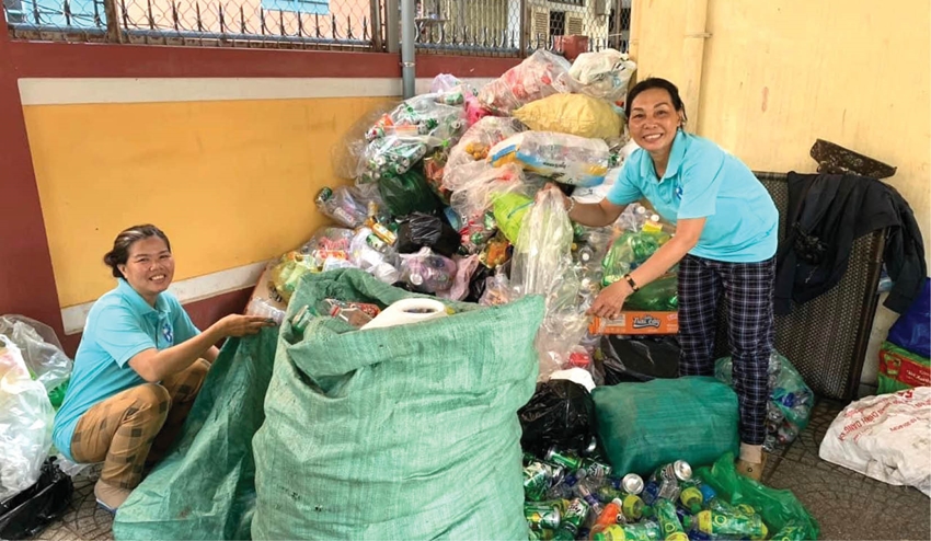 Việc thu gom, phân loại và tái chế chất thải rắn cũng là một công đoạn không kém phần quan trọng, giúp giảm ra môi trường một lượng rác lớn. Để có cơ sở triển khai thực hiện, Hội LHPN TP. Huế tổ chức rà soát thông tin về số lượng phụ nữ làm nghề thu mua ve chai cũng như số lượng các cơ sở thu mua tái chế phế liệu tại 36 phường/xã trên địa bàn để có phương án hỗ trợ phù hợp. Từ đó, Hội LHPN thành phố cùng với WWF thực hiện các mô hình như hỗ trợ cải thiện sinh kế, điều kiện và môi trường lao động cho nhóm phụ nữ yếu thế trong ngành tái chế phế liệu, tiến hành tập huấn kiến thức liên quan về bảo hộ lao động. Đồng thời, nhân rộng mô hình và thành lập các tổ hợp tác ve chai như ở phường Hương Sơ, An Đông, Thủy Vân...