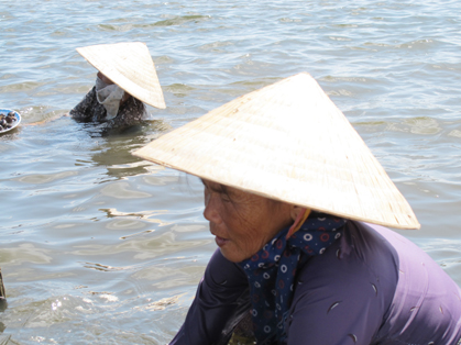 Để bắt được những con trìa trên phá, những người dân ở đây phải ngâm mình trong nước đến gần tận vai. Thi thoảng, các bà, các chị lại ngụp người xuống, đưa “chiến lợi phẩm” là những con trìa vừa cào được bỏ vào chiếc tô nhựa mang theo. Khi tô trìa đã đầy, họ lại đổ vào chiếc thùng xốp kéo theo bên mình. Bà Lương Thị Bê kể rằng: “Cần mẫn như thế, một ngày mỗi người bắt được khoảng 20kg trìa. Nếu gặp khách, số trìa ấy bán được khoảng 40 ngàn đồng, còn những lúc ế ẩm, khách trả cho 30 ngàn đồng cũng là may mắn lắm rồi”. Lặn lội từ 7 giờ sáng đến 2 giờ chiều, bà Bê, bà Thông mới nghỉ việc và bắt đầu bữa ăn trưa bằng những nắm cơm gói kỹ mang theo bên mình. Số tiền kiếm được mỗi ngày không nhiều, nhưng là nguồn thu nhập được các bà, các chị nâng niu, đánh đổi bằng bao mồ hôi, công sức, thậm chí có khi bằng cả những cơn đau ốm dài ngày. “Con cháu chúng tôi đều khổ nên có nguồn thu nhập này cũng đỡ rất nhiều...”- bà Lương Thị Thông như muốn giải thích vì sao ở cái tuổi này vẫn phải thân cò lặn lội như vậy.