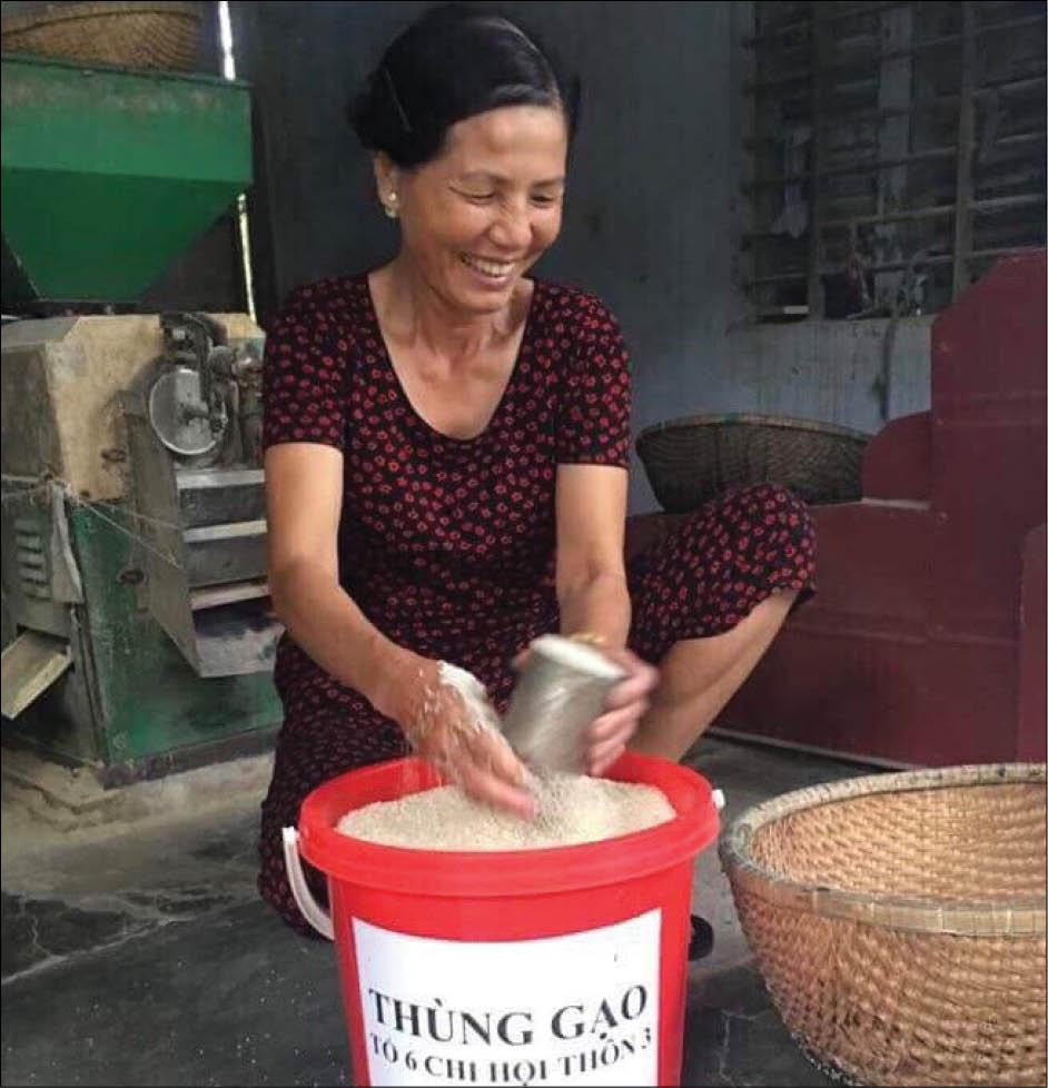 Hội viên Chi hội thôn 3 xã Quảng Ngạn đóng góp vào "Hũ gạo tình thương" tại điểm xay lúa