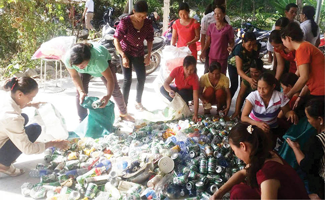Hội viên Hội LHPN xã Thủy Phù phân loại rác và quyên góp vỏ lon, chai nhựa cho mô hình "Tiết kiệm xanh"