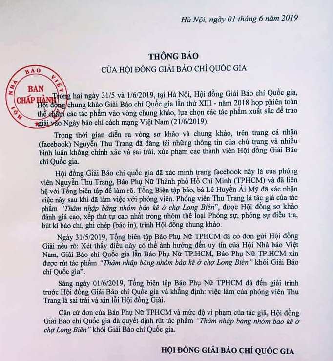 Căn cứ đơn của Báo Phụ nữ Thành phố Hồ Chí Minh và mức độ vi phạm của tác giả, Hội đồng Giải Báo chí Quốc gia đã quyết định rút tác phẩm "Thâm nhập băng nhóm bảo kê ở chợ Long Biên" khỏi Giải Báo chí Quốc gia.
