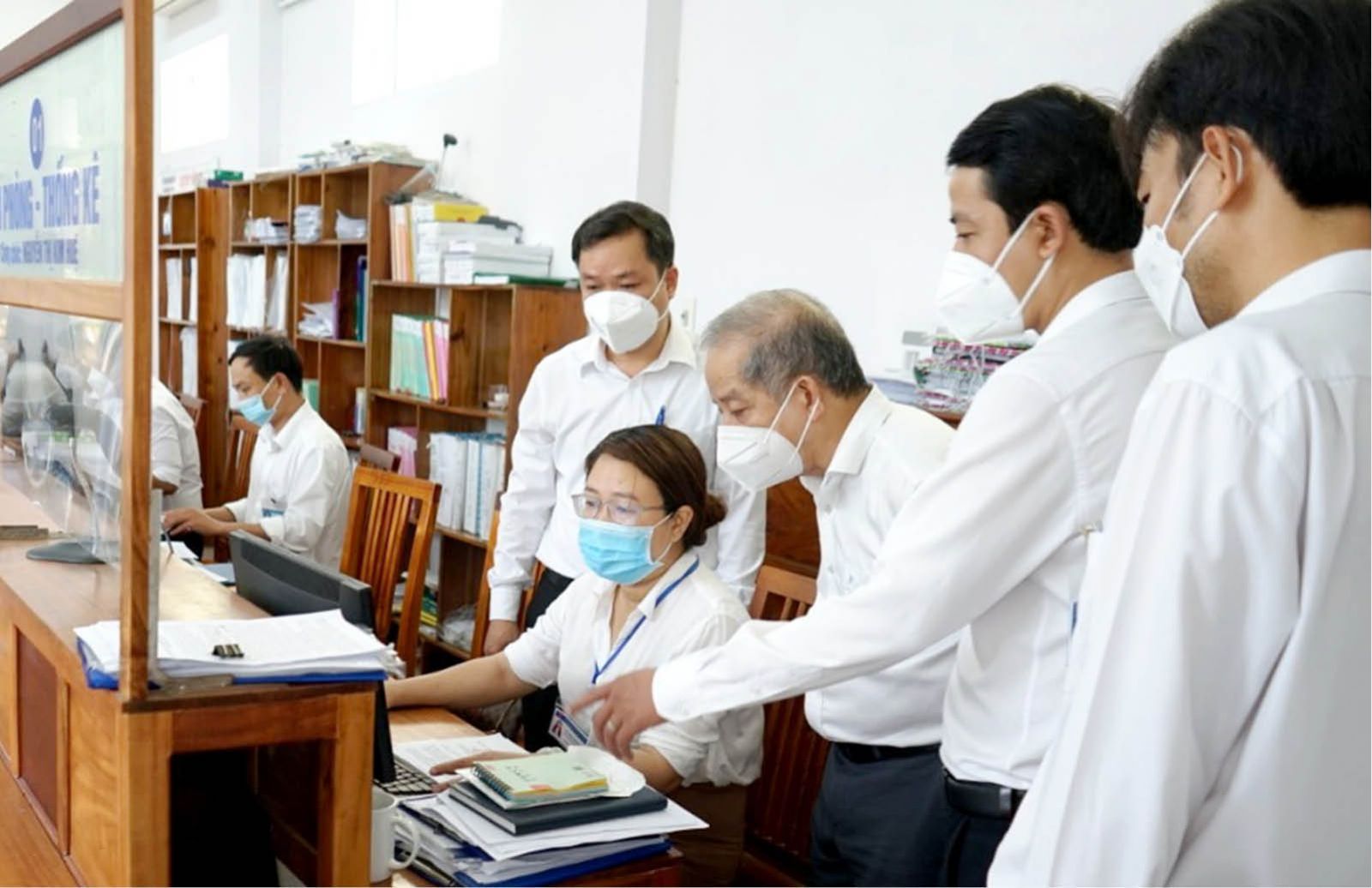 Phó Bí thư Thường trực Tỉnh ủy Phan Ngọc Thọ (giữa) kiểm tra mô hình cải cách hành chính ở phường An Tây (TP. Huế)