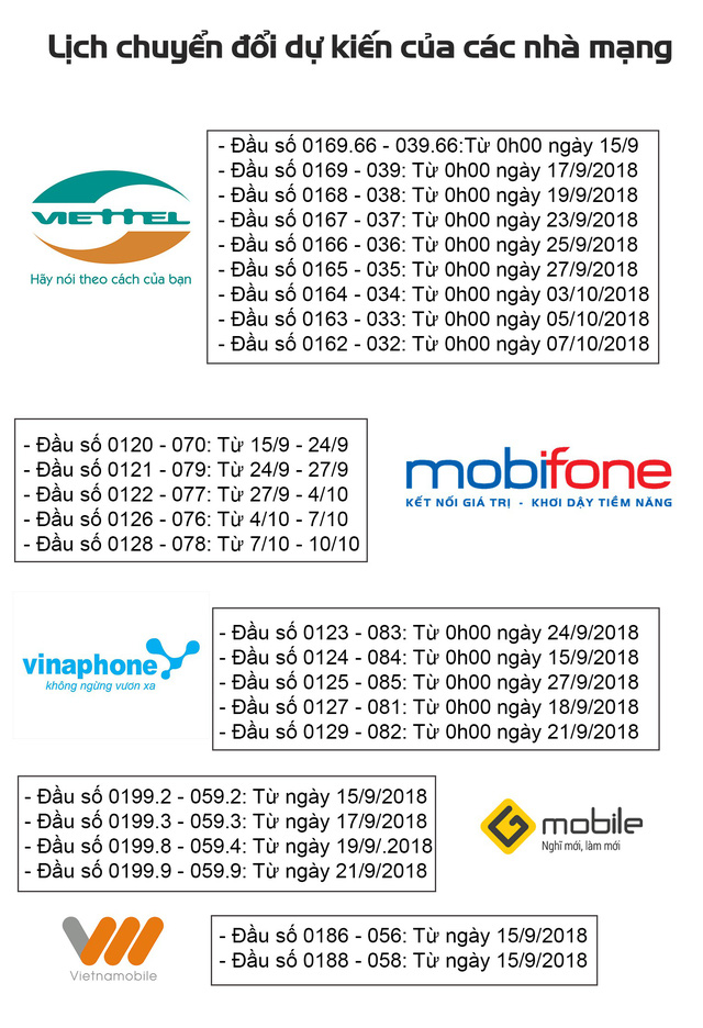 Theo lịch chuyển đổi dự kiến, việc chuyển đổi đầu số thuê bao di động sẽ bắt đầu từ ngày 15/9/2018 và kết thúc vào ngày 30/6/2019. Khi tiến hành chuyển đổi các nhà mạng sẽ phải quay số song song (duy trì cả số cũ và số mới) từ ngày 15/9/2018 đến ngày 14/11/2018. Các nhà mạng vẫn duy trì âm báo bằng tiếng Việt và tiếng Anh trong giai đoạn trên.