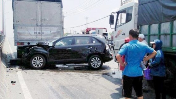 Vụ tai nạn giao thông liên hoàn giữa ô tô 7 chỗ và 2 xe tải xảy ra ở cầu Bình Thuận, quận Bình Tân, TPHCM ngày 17/4/2017