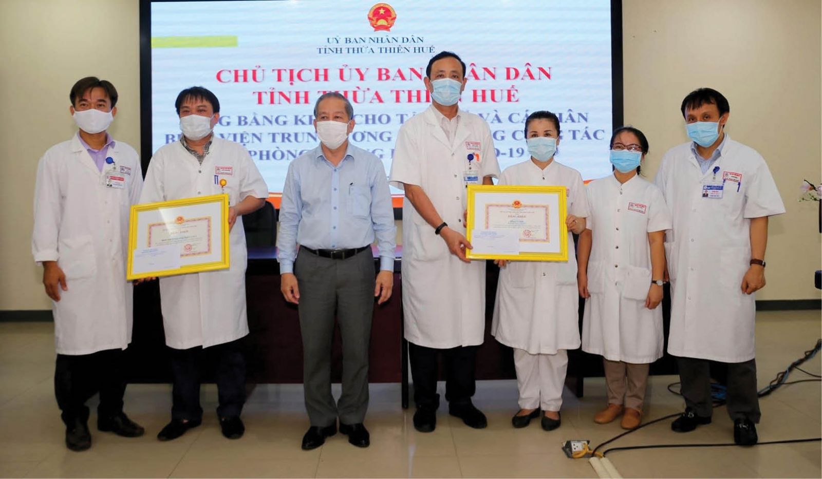 Chủ tịch UBND tỉnh Phan Ngọc Thọ (thứ 3 từ trái qua) tặng Bằng khen cho lực lượng y tế Bệnh viện Trung ương Huế có thành tích xuất sắc trong phòng chống dịch COVID-19